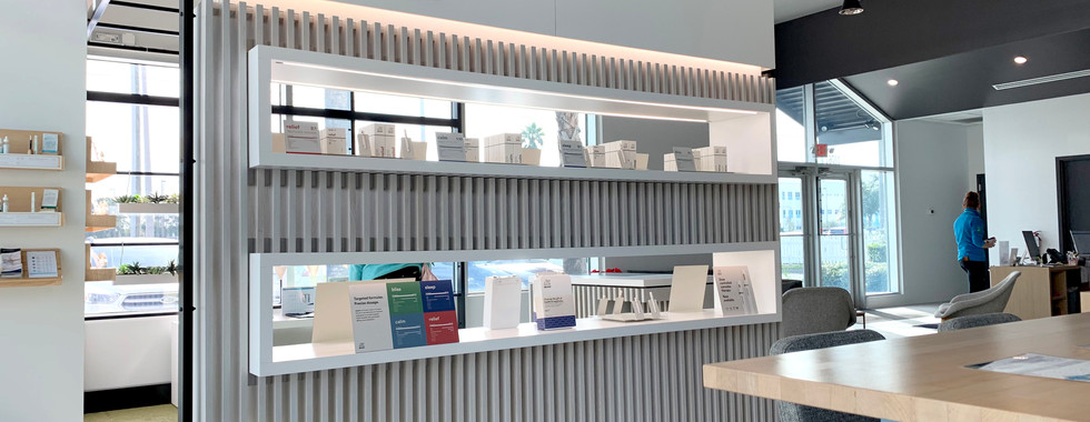 Starting with established brand equity, we looked to the elements of the brand that make it unique in the market place. One differentiator for dosist is the brand's reputation for high quality products as well as the efficacy and delivery of precise dosages. The idea of precision is visually represented in the brand by the thin line that appears on the product packaging and some supporting branded collateral elements. Taking a cue from that design detail, Budder began to work on concepts that incorporate that thin line as a reveal element in the physical components. This was achieved by allowing negative space between elements to create a floating effect. The reveal and floating elements play well with the concept of precision and nods to the effect of the product itself. These elements became tentpoles for design of the SIS and merchandising KOP and is intentionally carried throughout the systems.